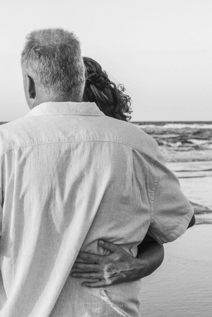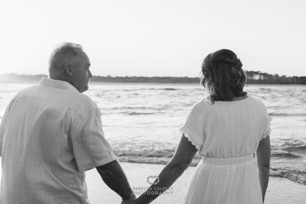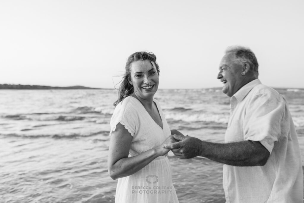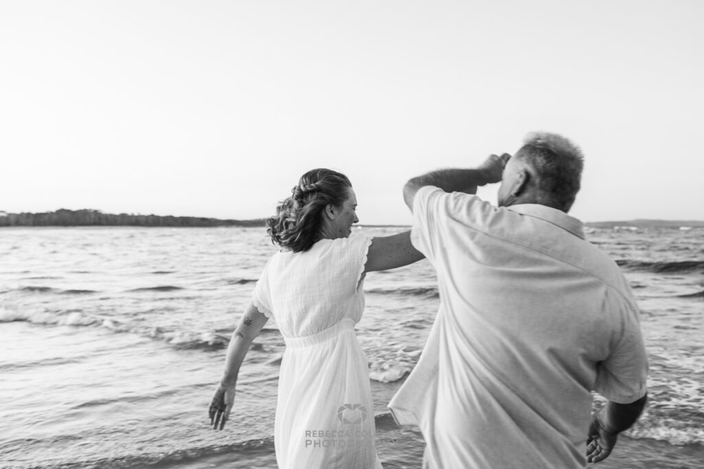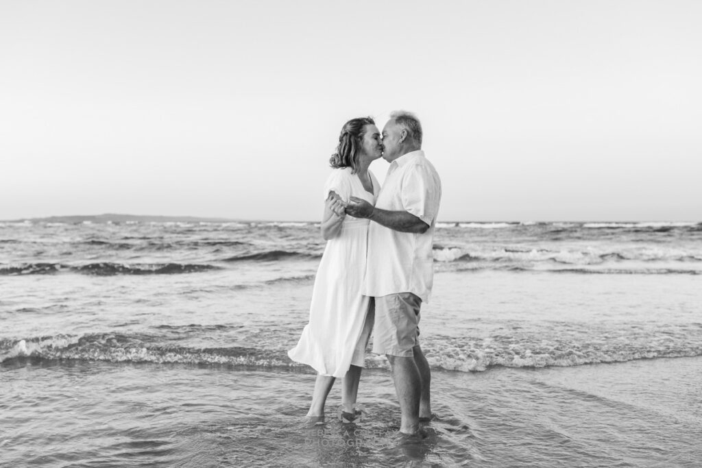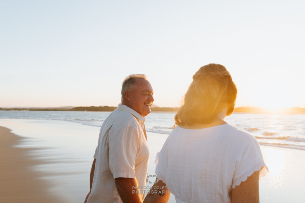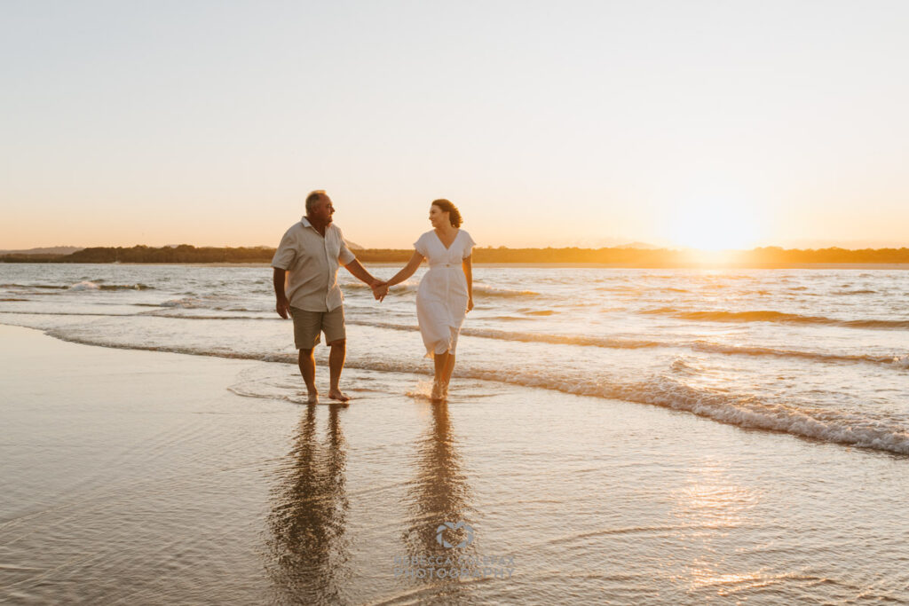 An anniversary photographer in Noosa on an evening like this has very little work to do beyond being in the right place at the right time. A couple who have been together long enough to be completely comfortable with each other, white linen, a beach that faces the setting sun and that particular quality of light that turns everything golden in the last thirty minutes before dark. These are the conditions that make images like this possible.