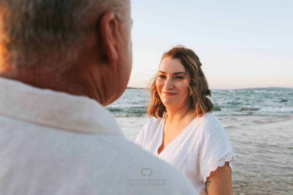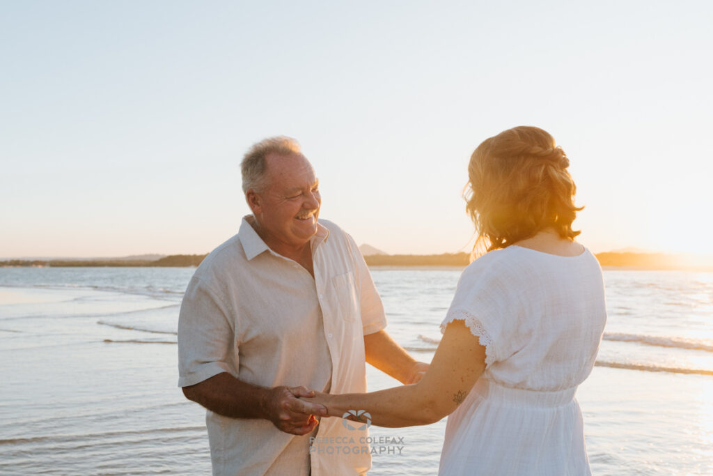 Soft, complementary tones photograph beautifully against the pale sand and warm light of a Noosa beach at sunset. White and cream linen, soft neutrals and earthy tones all work well. Avoid very busy patterns and keep the colour story cohesive without being too matched. Getting in touch before the day means any outfit questions can be sorted well in advance.
