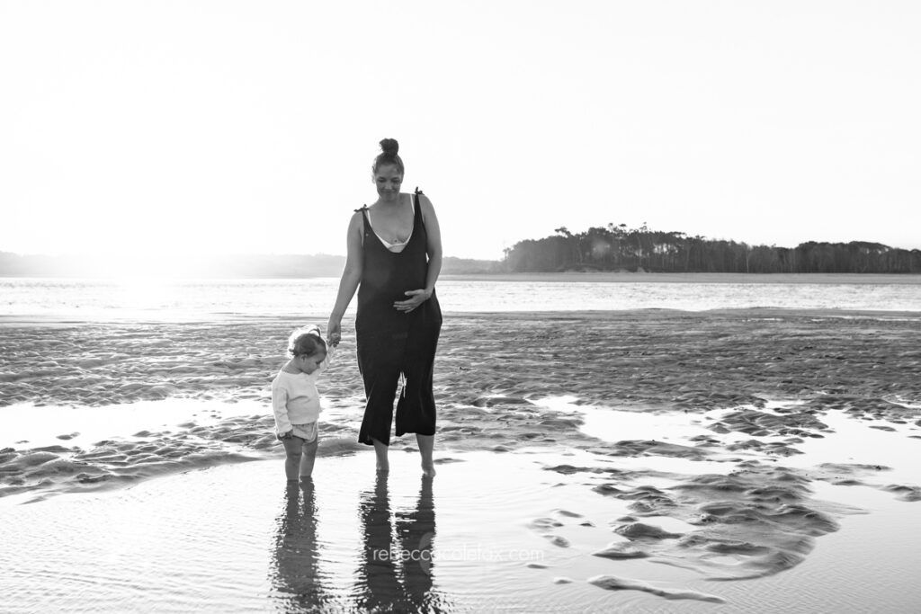 The toddler running ahead and turning back to check mum is following. The little hands reaching up to touch the bump with a curiosity that is completely her own. Mum crouching down in the shallows, bump out, laughing at something only the two of them understand. These are not directed moments. They are completely real and they are the ones that matter most.