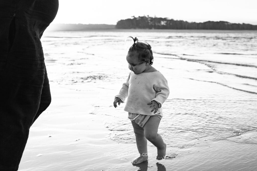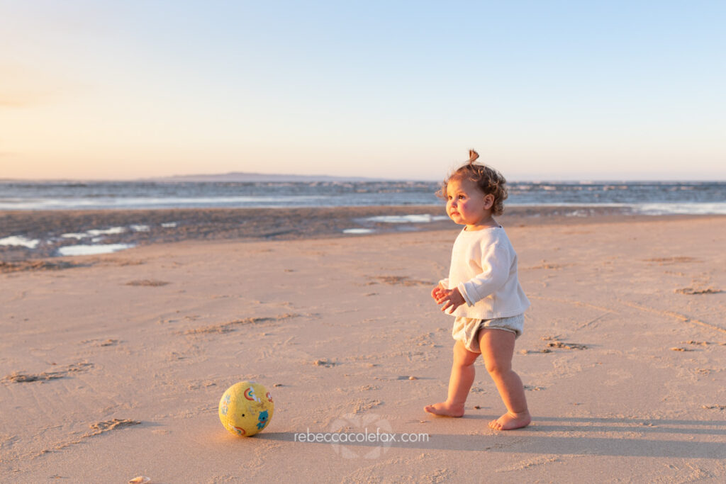 Baby and belly sessions work best at golden hour on the beach. The light is soft and warm, the toddler is distracted by the water and the waves and the whole session has an energy that a posed session simply cannot replicate.