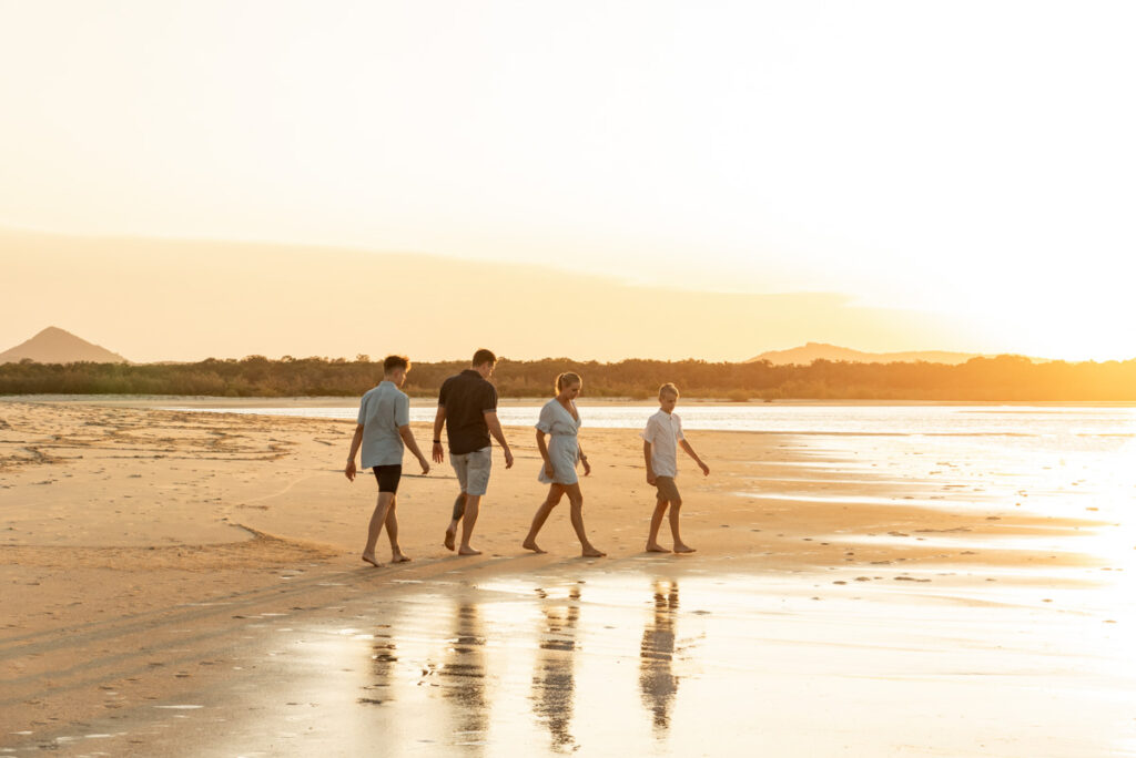 A family photography shoot in Noosa at golden hour is one of the most beautiful things this coastline has to offer. The light in that last hour before sunset does something extraordinary to everything it touches, warm and low and generous, turning the water into a mirror and wrapping the whole family in a glow that no other time of day can replicate.