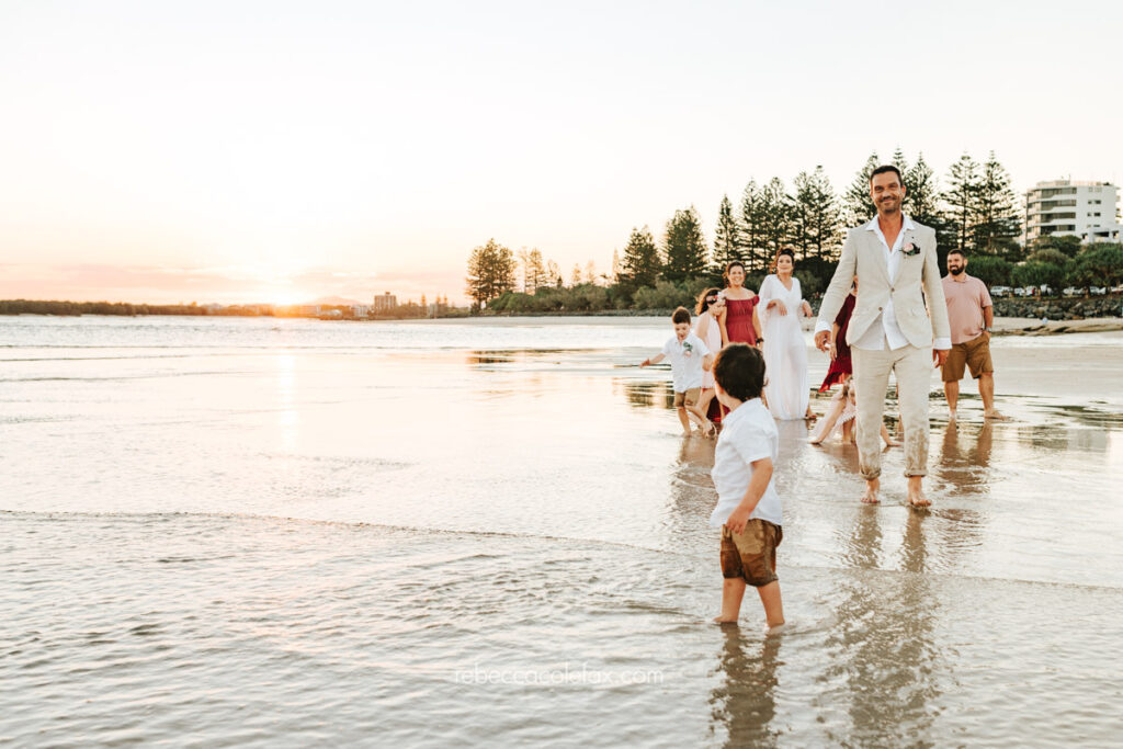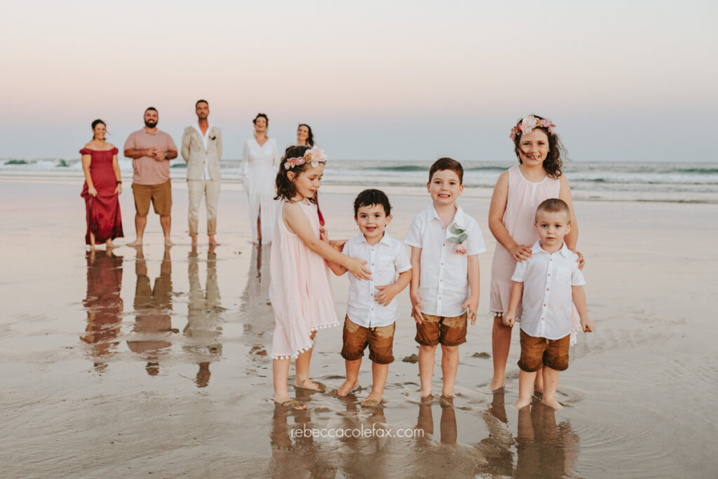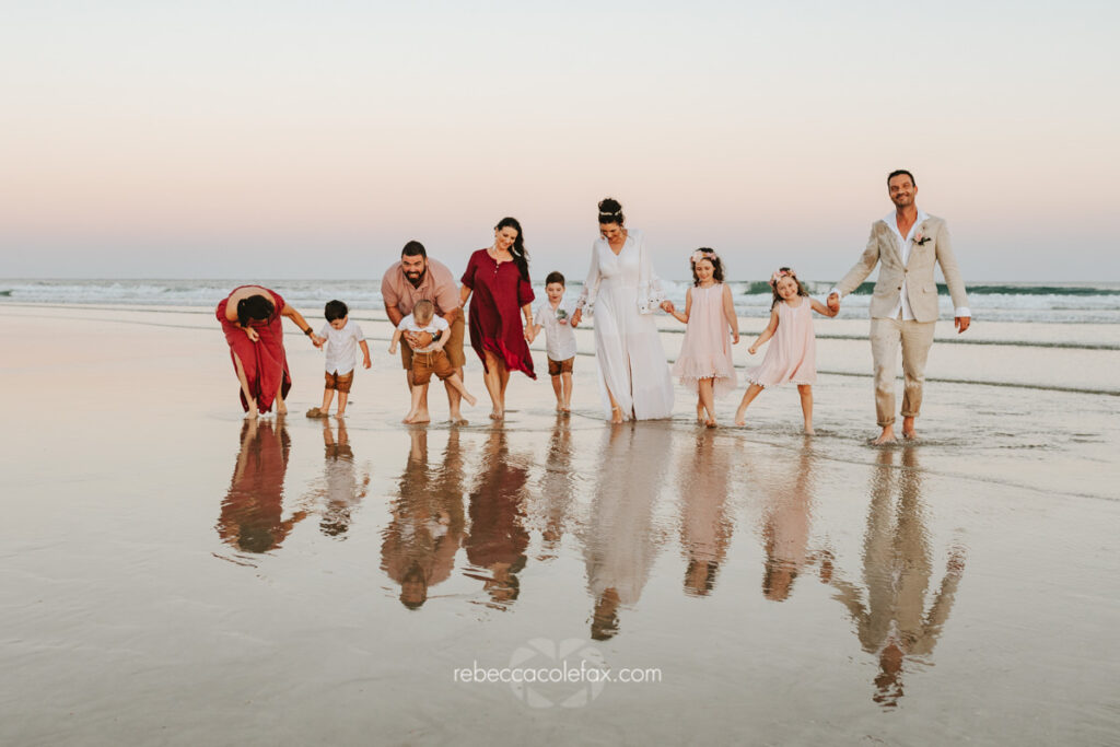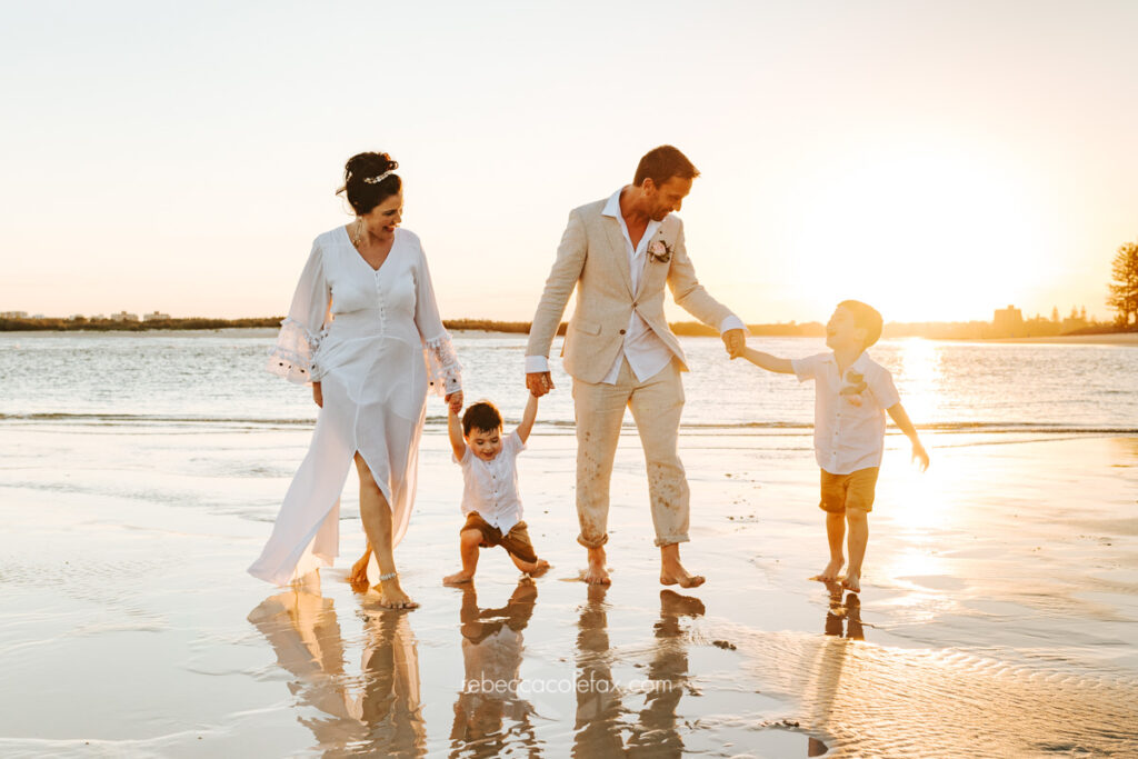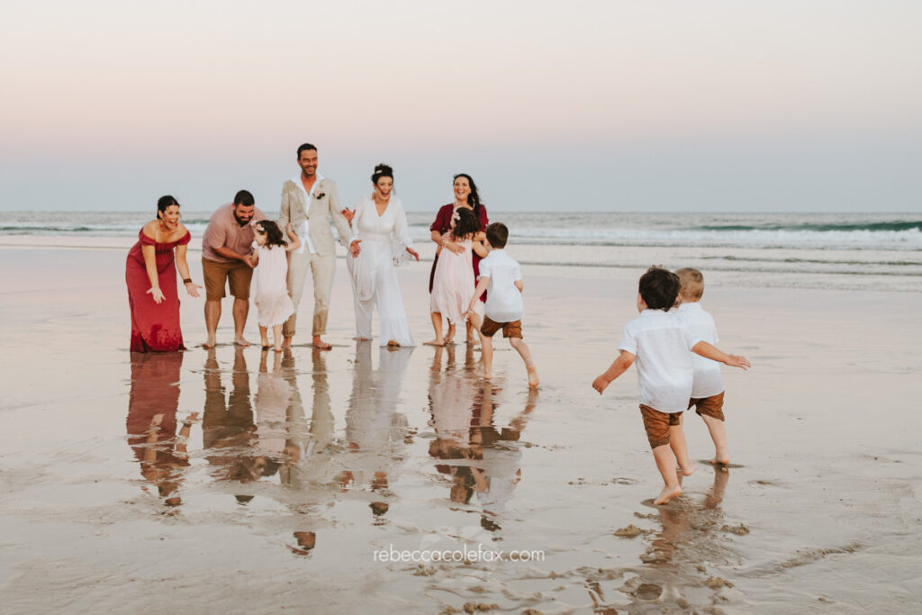 Elopement photography Sunshine Coast captures something that a full wedding rarely can. Just the two of them. The kids. The beach. A bouquet. Vows said quietly to each other in the kind of light that only arrives for about forty minutes on a clear afternoon and then disappears completely.