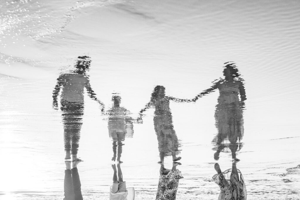 The reflection shot from this session, four silhouettes perfectly mirrored in the wet sand at golden hour, is the kind of image that happens when the conditions, the family and the timing all arrive at exactly the same moment. You cannot plan for it. You just have to be there when it happens.