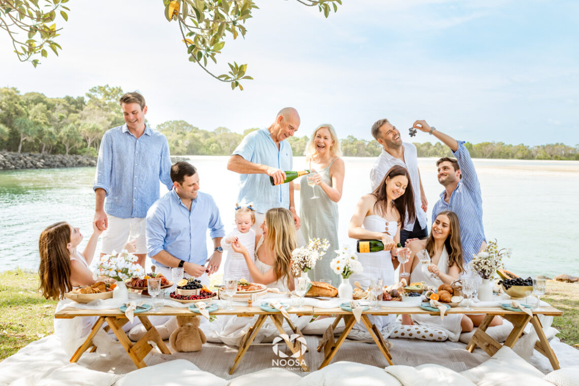 By the time the portraits were done, the table setting was ready. The family gathered around for the Last Supper composition they had spent months planning and the results were exactly what everyone had hoped for. The Noosa River provided the perfect backdrop: calm water, lush surrounds and soft morning light that made the whole concept feel considered and real rather than staged.