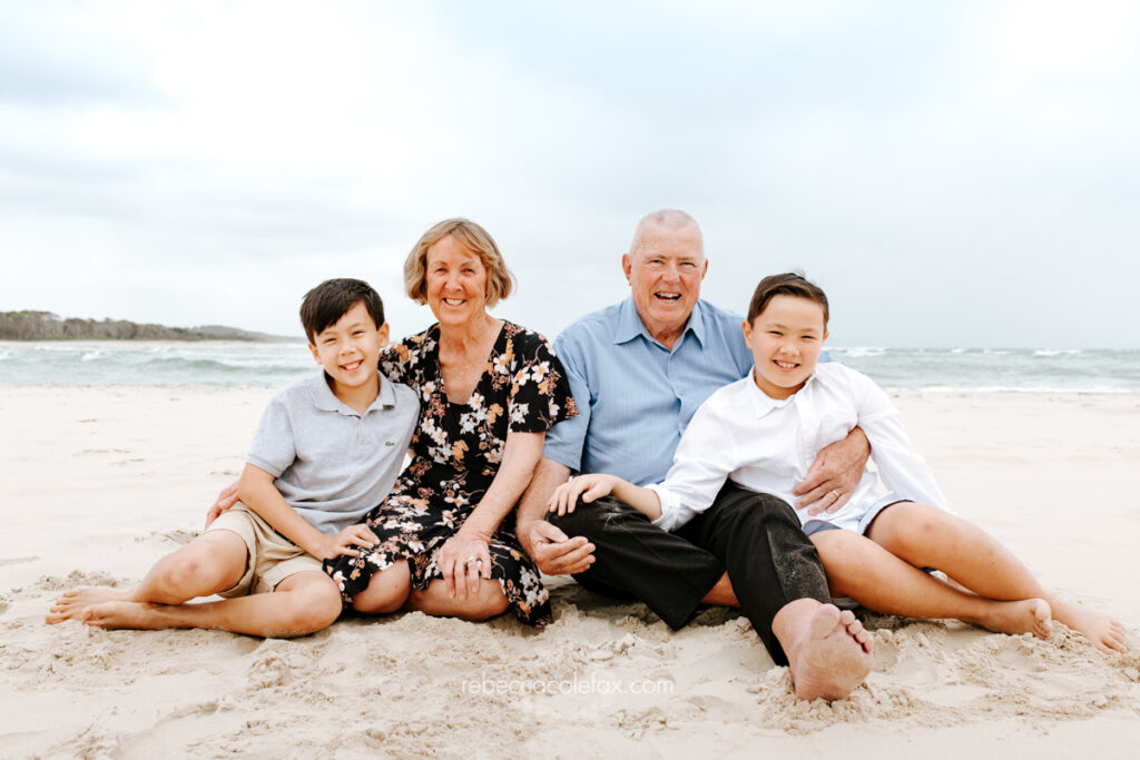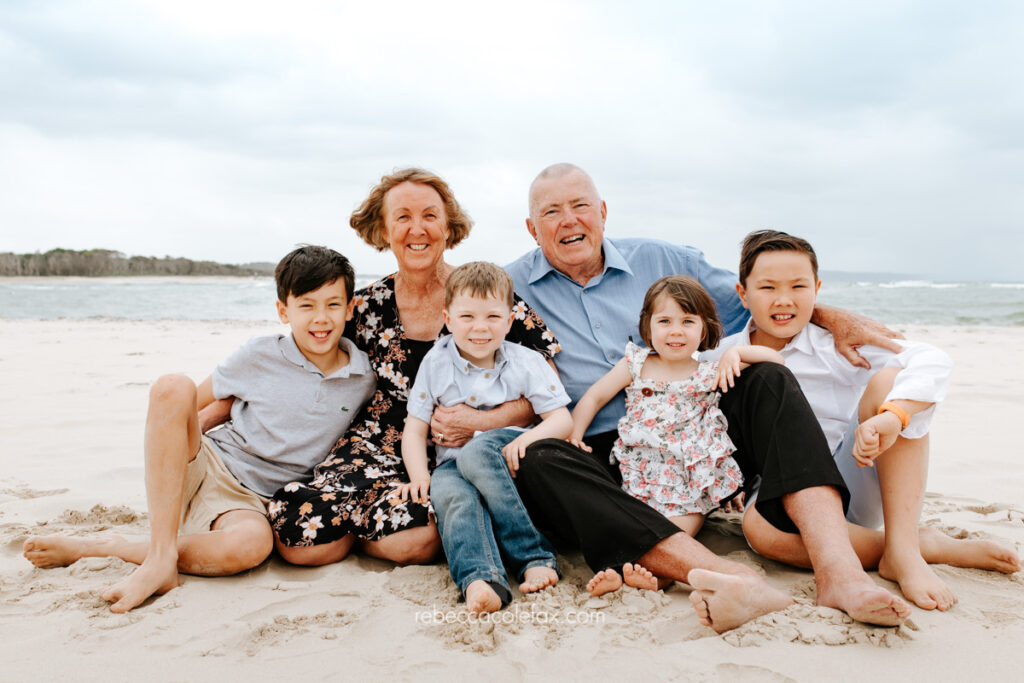 This session was organised as a gift for a grandmother. The whole family came together on a cloudy afternoon on the Sunshine Coast, three generations, grandparents, parents, kids and grandkids, all in the same place at the same time. When she first saw the photographs she was overwhelmed. That reaction is exactly why family photos as a gift work so well.