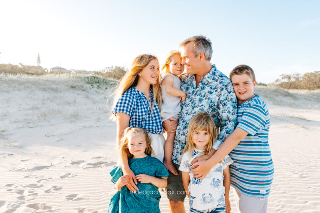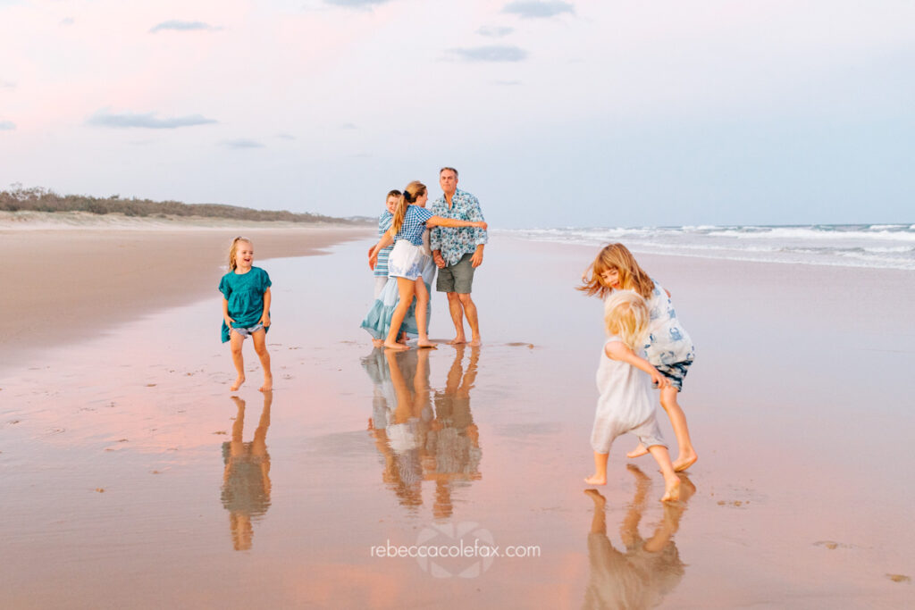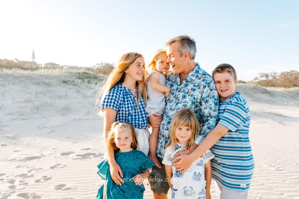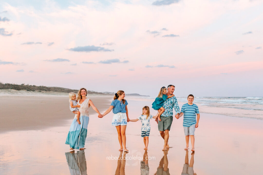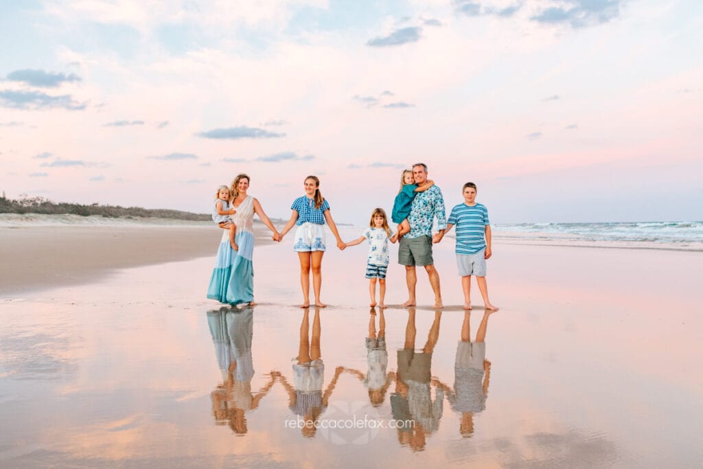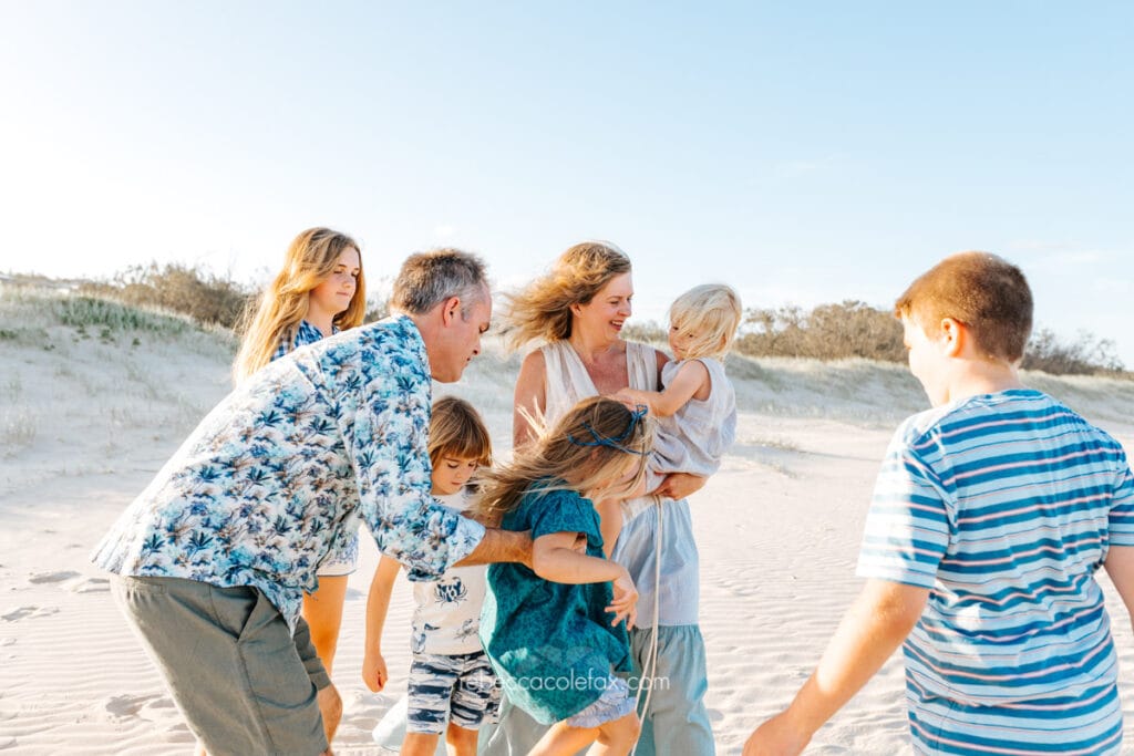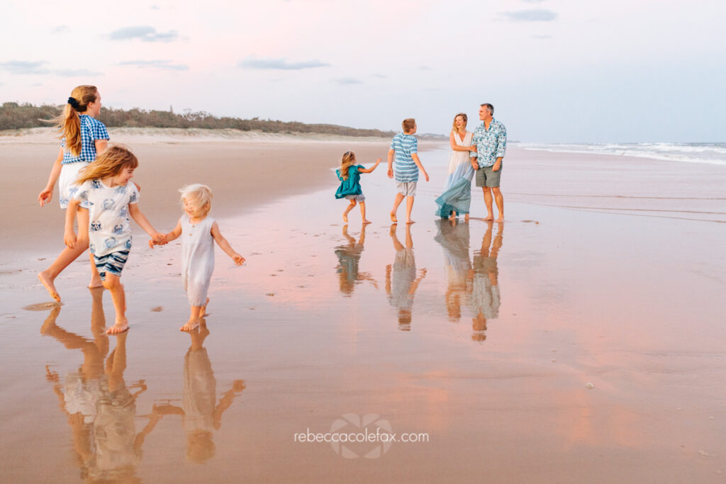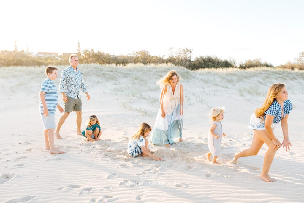 Large family photographer Noosa sessions are some of the most rewarding and the most chaotic in the best possible way. Seven people on a beach at golden hour, multiple little ones, coordinated outfits, the particular energy of a family that is loud and close and completely themselves together. Getting all of that into a single gallery that everyone walks away loving takes more than pointing a camera at a group.