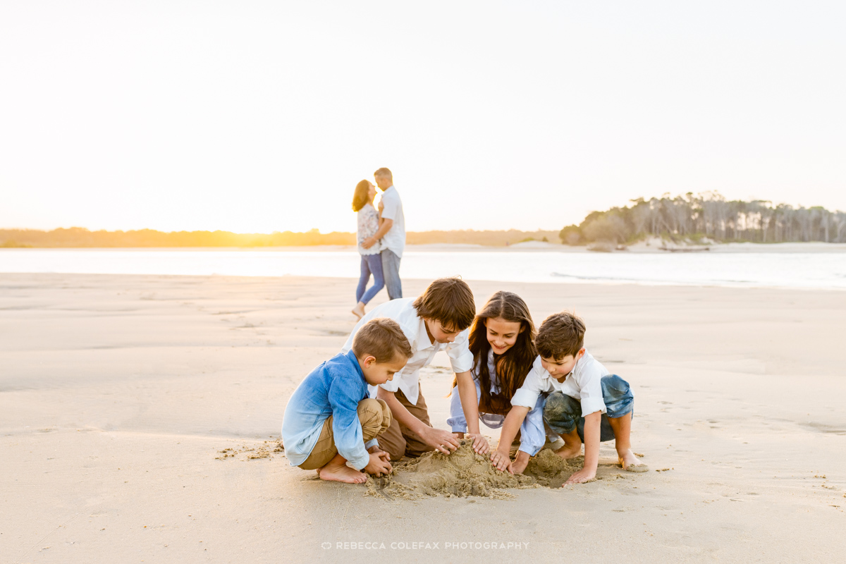 What is the best location for large family photos in Noosa? Noosa Main Beach is one of the best locations for large family sessions on the Sunshine Coast. The wide flat sand gives everyone room to move, the rocks at the southern end provide a different backdrop and the shallow water at the shoreline is irresistible for kids of all ages. The golden hour light on this beach is exceptional.