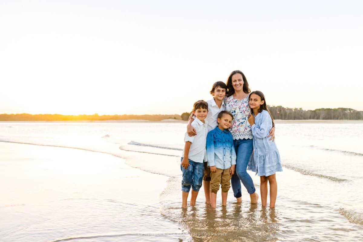 What time of day works best for large family photos in Noosa? The hour before sunset is ideal. The light is warm and soft, kids are generally past nap time and the beach is less crowded. For large families with a range of ages it also tends to be the time of day when everyone is most relaxed and the candid moments come naturally.