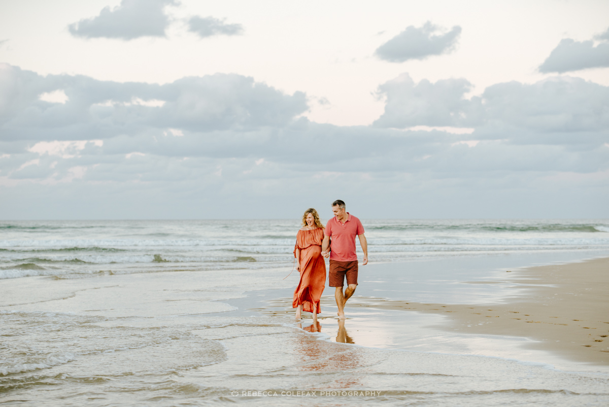 Four children. A boy on the way. A beach at golden hour. Noosa Photography Co held it all together with patience, warmth and the experience to know that with multiple small children the best images come from noticing what is already happening rather than trying to direct it. Dad bending down to his daughter with a flower. The whole family walking through the shallows hand in hand. The couple stealing a quiet moment while the kids ran ahead.