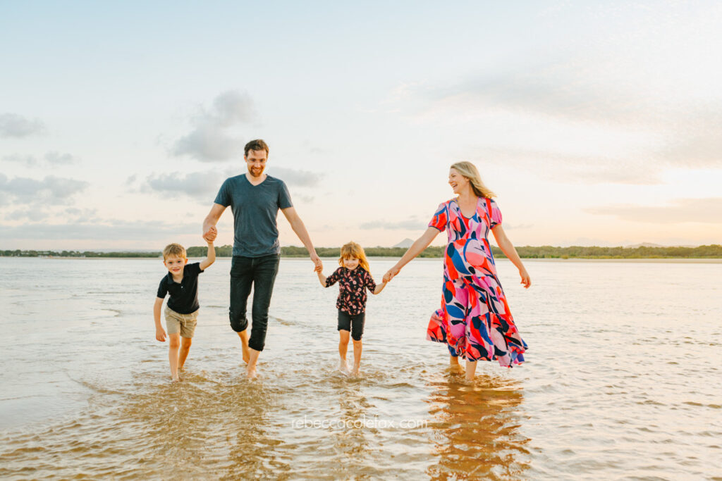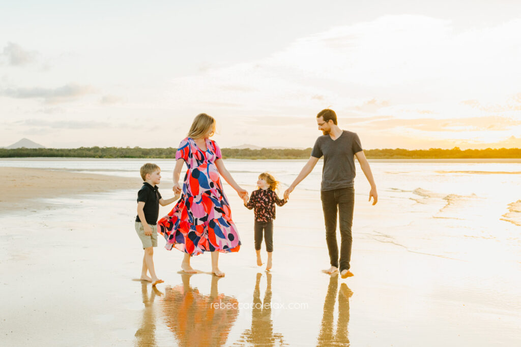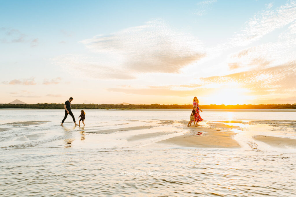 As a Noosa maternity photographer with kids Noosa Photography Co knows that the sibling shots are often the ones that matter most. The wide shot of the whole family silhouetted against that sunset with the water reflecting everything back is one of our favourite images from this session. Four people about to become five, right there in one frame.