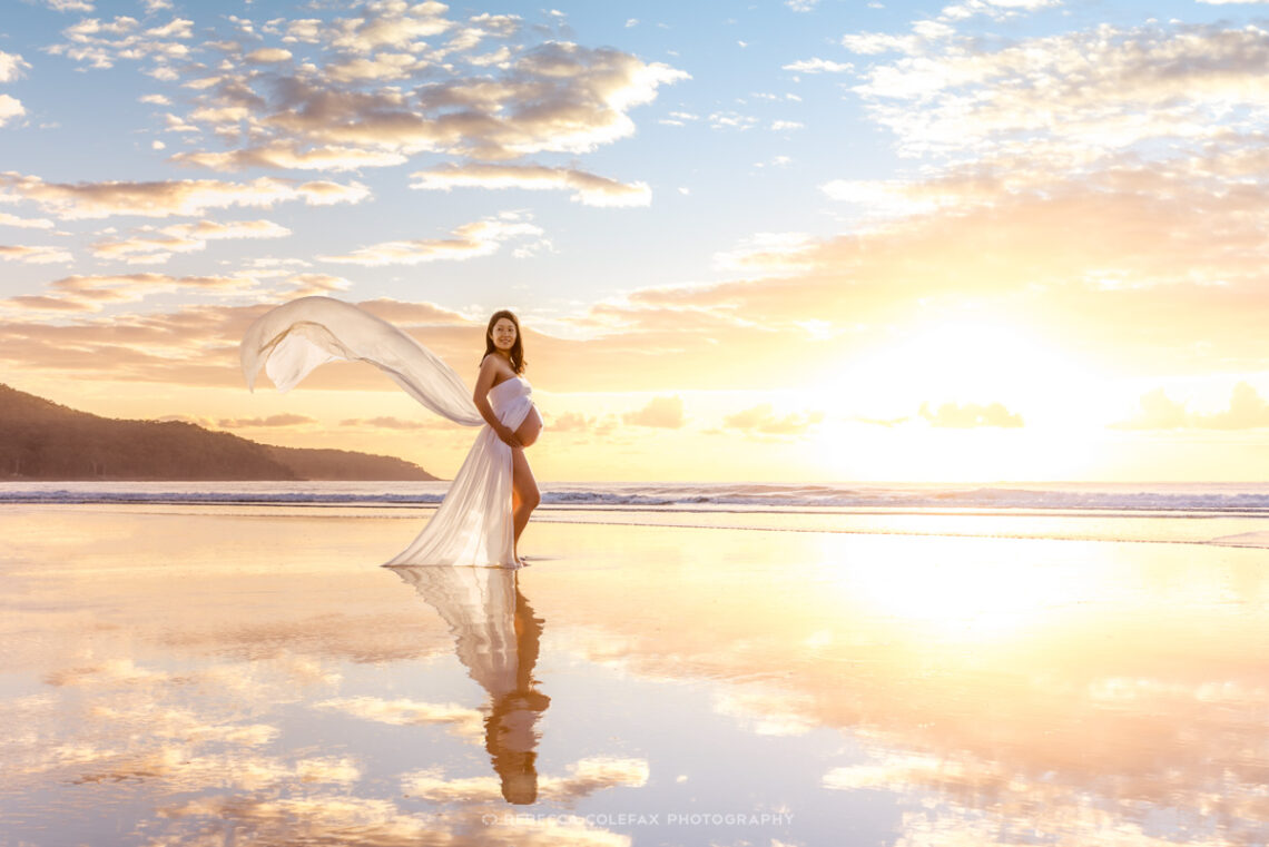 The result speaks for itself. That reflection shot, the whole sky mirrored in the wet sand at Main Beach with the fabric lifting into the air and Noosa Headland glowing in the background, is one of the most spectacular maternity images in the Noosa Photography Co gallery.