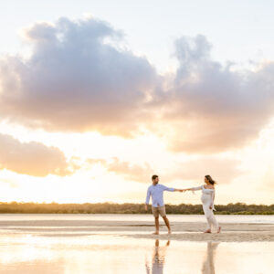 Why is Noosa Main Beach a good location for maternity photos? Noosa Main Beach has a combination of elements that very few beaches can offer. The wide open sand, the flat water at low tide, the extraordinary reflections and the Noosa Headland as a backdrop. At golden hour it is one of the most photographically rich locations on the entire Sunshine Coast.