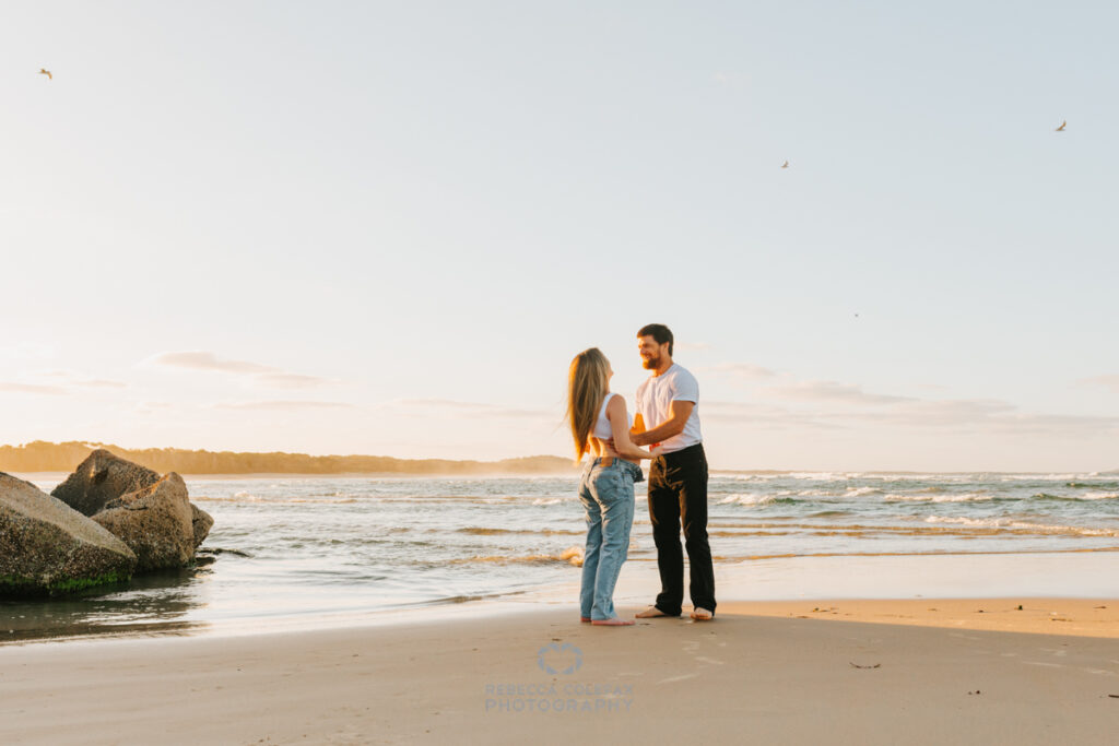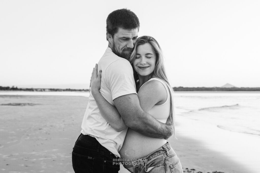 What should we wear for a sunset beach maternity session? Simple and light always works best. White, cream, soft neutrals or casual denim. Avoid busy patterns and logos. The sunset and the location provide all the colour and texture the images need. Noosa Photography Co sends all clients a full styling guide before their session.