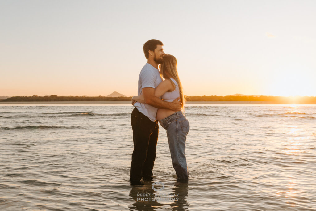 This couple arrived at the beach relaxed, dressed simply in white and denim, with no idea just how beautiful the evening was about to get. The sunset delivered everything. Warm golden light across the water, long reflections on the wet sand, that particular Noosa glow that makes every image look like it was made for a frame.