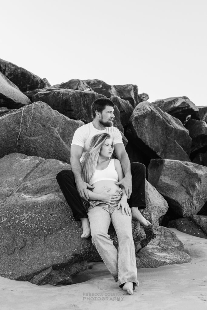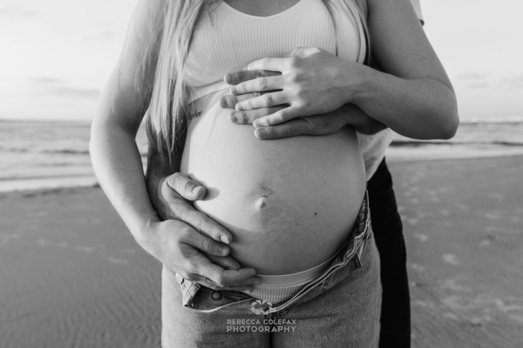 The images from this session speak for themselves. The couple standing in the shallows backlit by a sky that turned every colour at once. The belly detail in black and white. The wide shot with the whole beach behind them and the sun dropping low on the horizon. Every frame feels like the last five minutes of a perfect day because that is exactly what it was.