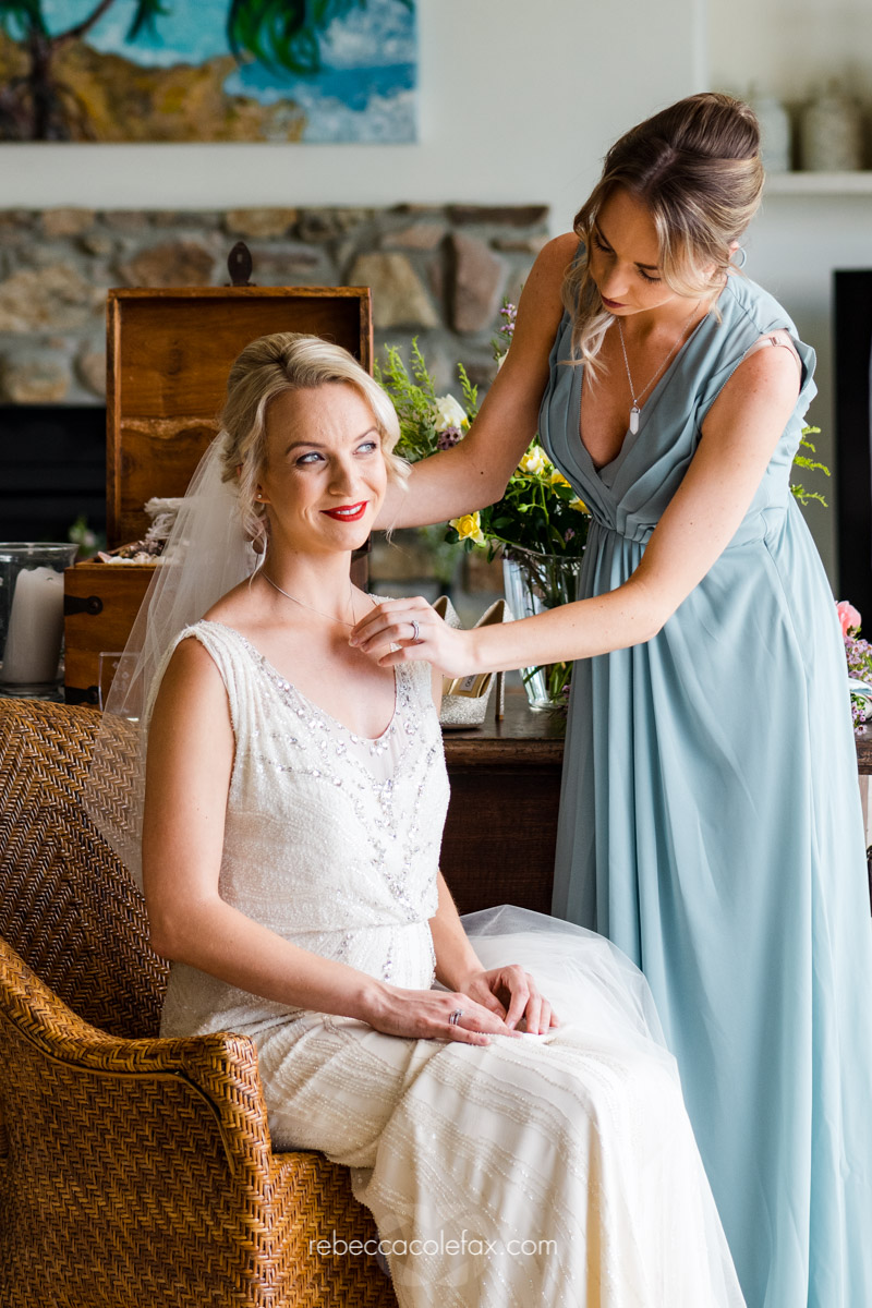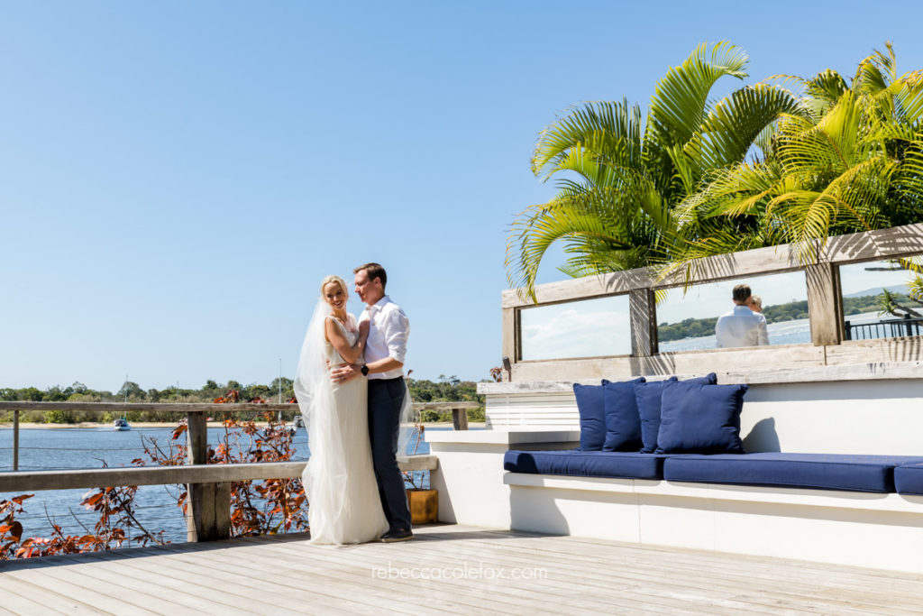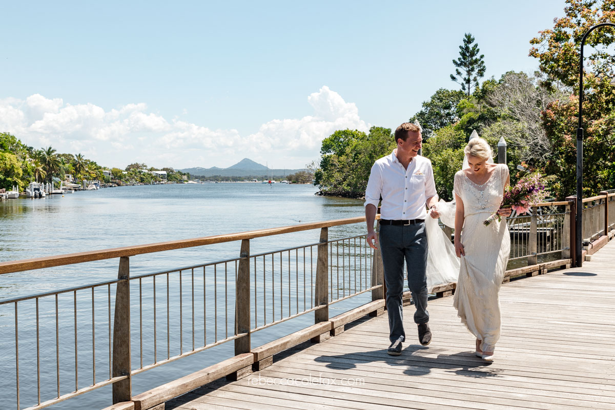 After the ceremony the couple walked the Noosa River boardwalk for portraits, Mount Coolum sitting on the horizon behind them and the whole river opening up to the left. Claire in her beaded Jenny Packham gown and Dave in a relaxed white shirt, completely at ease and completely happy.