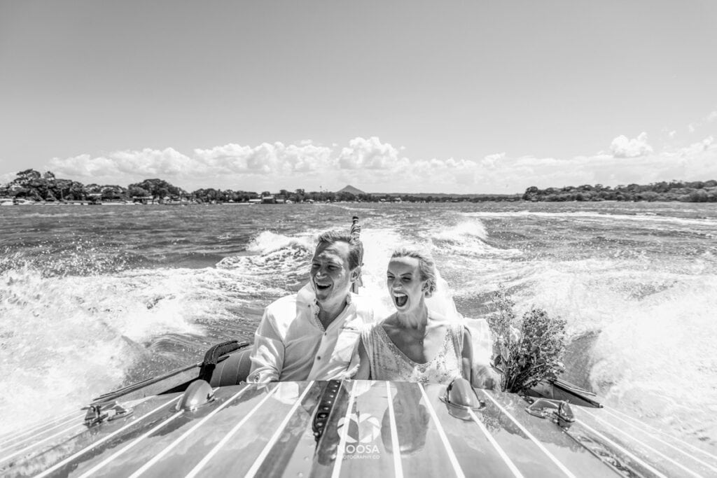 Noosa wedding photographers needs to be as comfortable in a lush hinterland garden as they are on a wide open beach at golden hour. As at ease with an intimate elopement of three as with a full wedding party of fifty. As prepared for a vintage timber speedboat on the Noosa River as for a kangaroo wandering into the bridal party at a golf resort.