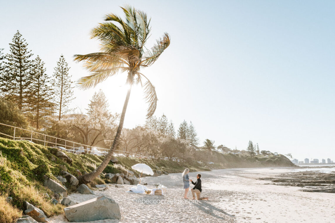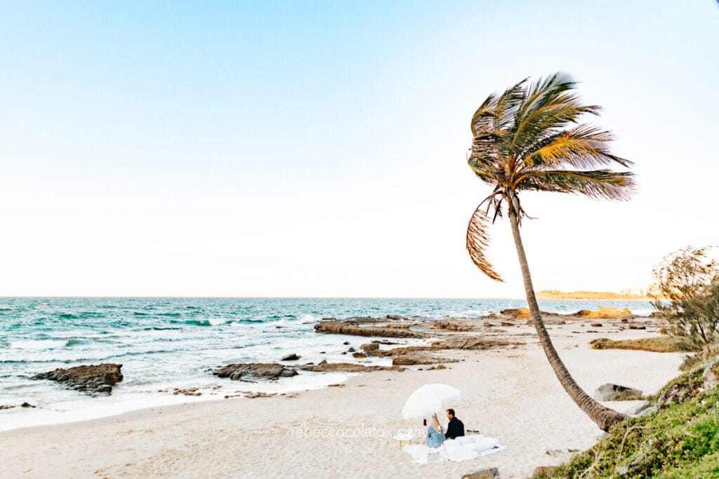 A proposal shoot Sunshine Coast delivers something that no other stretch of coastline in Australia quite matches. The variety here is extraordinary. Patrolled beaches, hidden rock platforms, leaning palms, styled picnics on wide open sand. Every couple gets something that looks completely their own because every location along this coast feels different from the last.