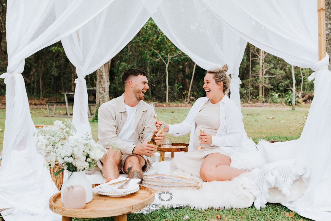 Secret proposal photography in Noosa is something Noosa Photography Co does with care and precision every time. But this one had a detail that made it extra special. She was pregnant with their first baby. He had planned everything. The gondola. The white draped canopy on the Noosa River. The picnic. The ring. And she had absolutely no idea.