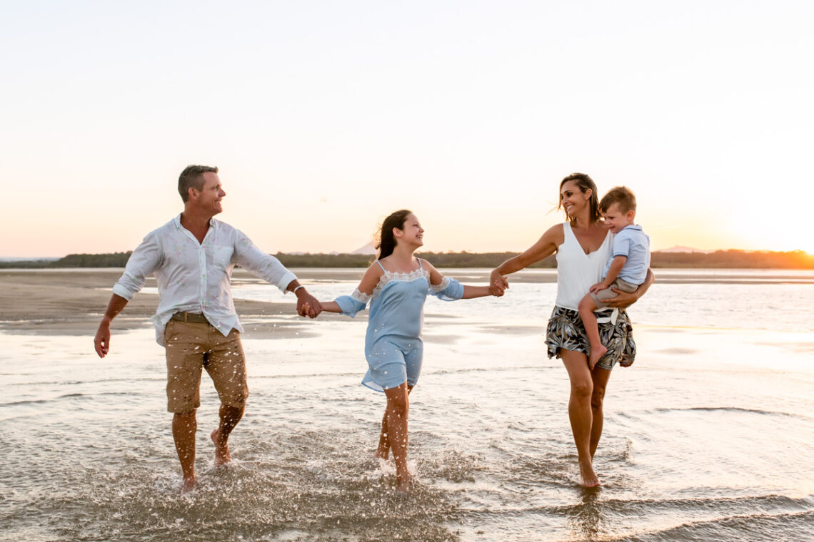 Sunset family photos in Noosa have a quality that is genuinely hard to replicate at any other time of day. The light is warm and low, the beach quietens down, and everything just looks better. This session at the Noosa River mouth is a good example of why so many families specifically request that late afternoon window.