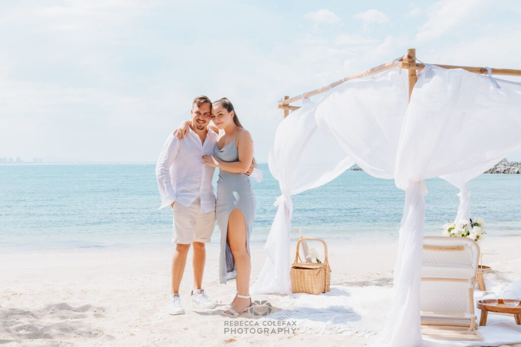 The canopy was set up on the sand with white draped fabric, a low timber table, a rattan basket, white florals and champagne. Every detail considered. The whole thing looked effortless and was anything but.