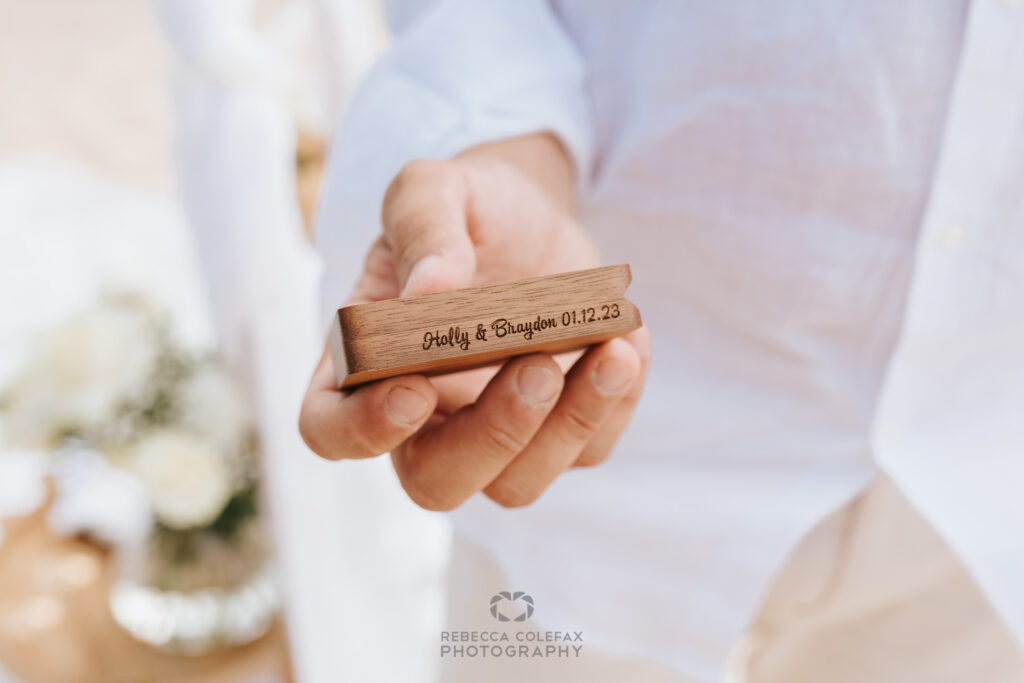 Sunshine Coast engagement photography at its best happens when the location, the styling and the moment all arrive at the same time. This one had all three. Mooloolaba Spit on a bright morning. A white draped canopy on the sand. A pale blue dress. An engraved wooden keepsake with their names and the date. And a man on one knee with the Mooloolaba skyline sitting behind him across the water.