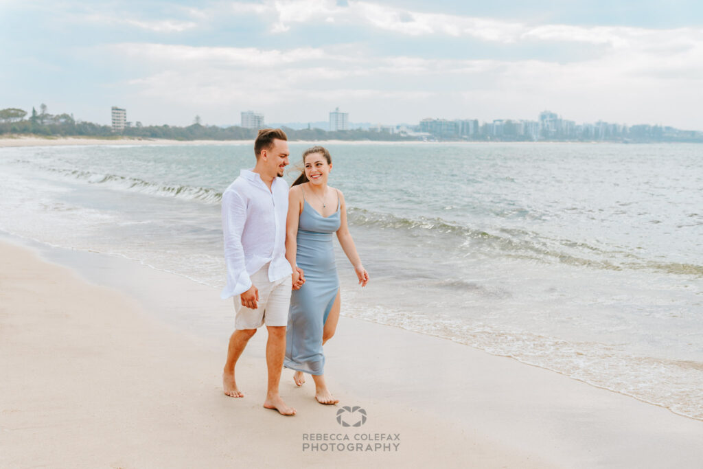The portraits that followed had that particular quality that only comes in the moments after an engagement. Still slightly disbelieving. Looking at the ring. Looking at each other. Laughing at nothing in particular. Walking the shoreline at the Spit with the light on the water and the whole Sunshine Coast laid out around them.
