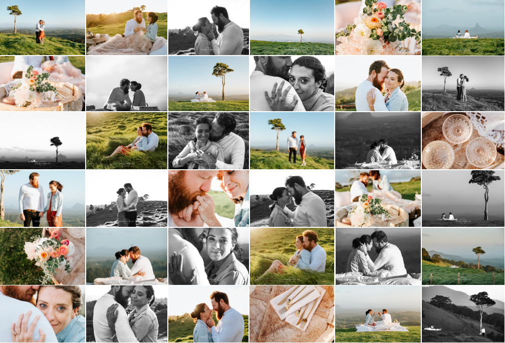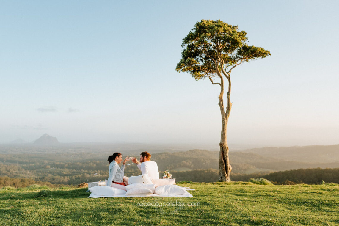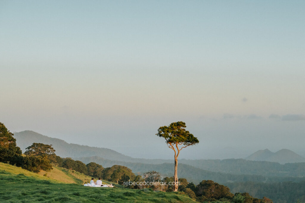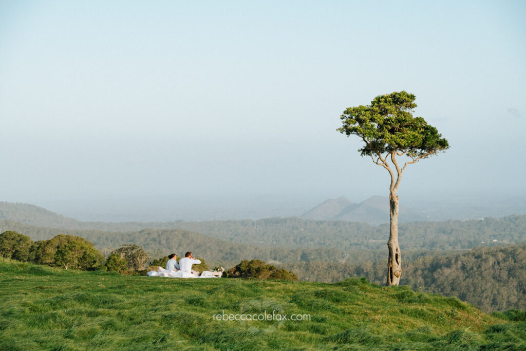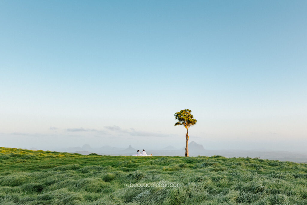 Why choose the Sunshine Coast hinterland for an engagement session? The hinterland offers something completely different to a beach session. Wide open green hills, dramatic skies, the Glass House Mountains on the horizon and complete privacy create a setting that is genuinely unlike anything on the coast. For couples who want something extraordinary and entirely their own it is one of the most beautiful locations in Queensland.
