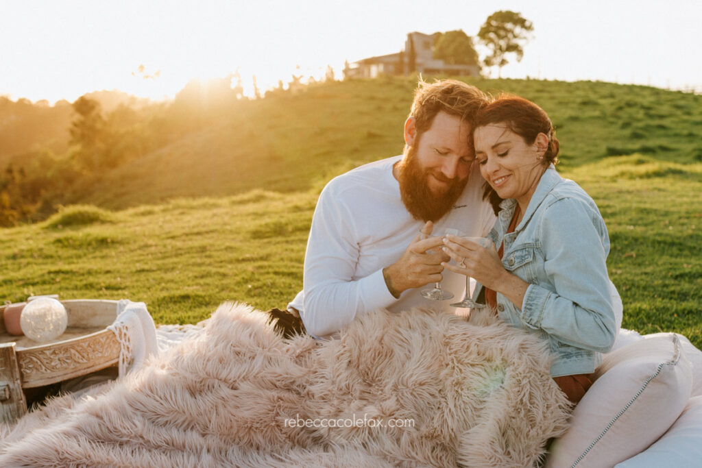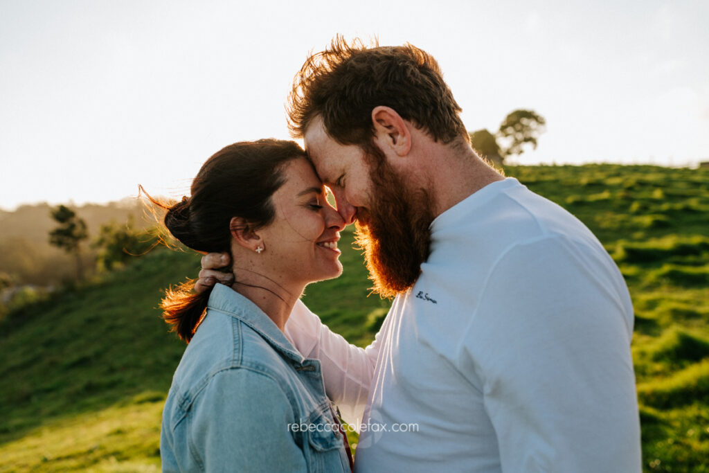 The session was planned carefully around the sunset. Timing in the hinterland is everything. The way the afternoon light moves across the hills, the moment the sun drops low enough to turn the long grass gold, the extraordinary warmth that settles over everything in that last hour of the day. All of it was considered well in advance so the couple simply arrived and the landscape did the rest.