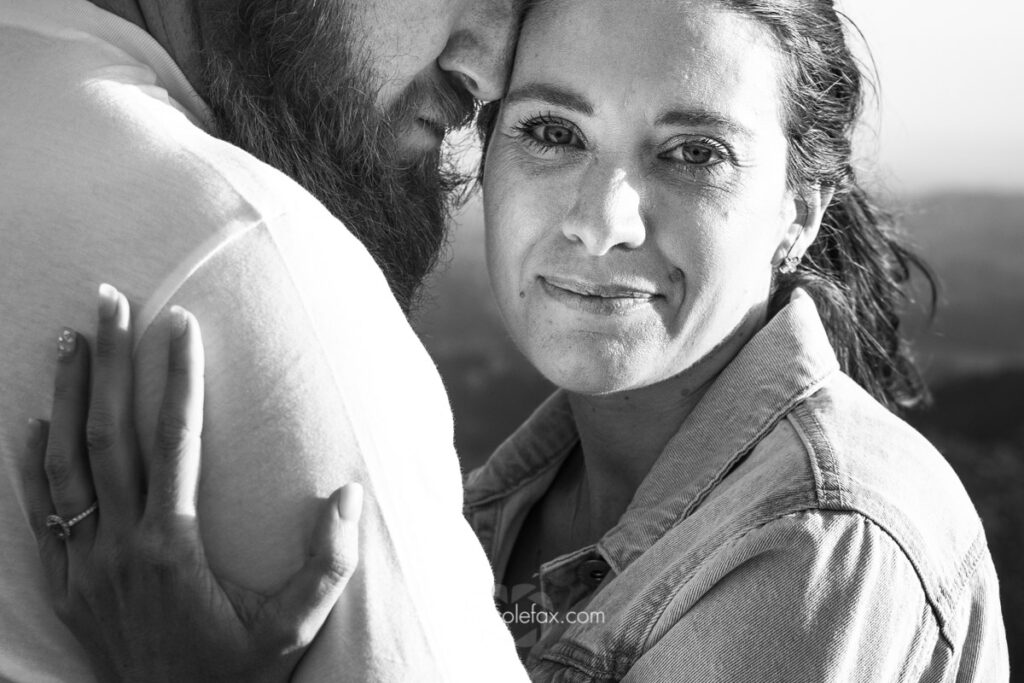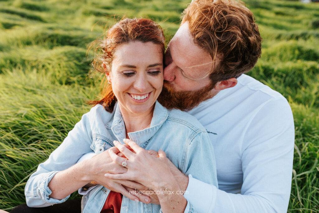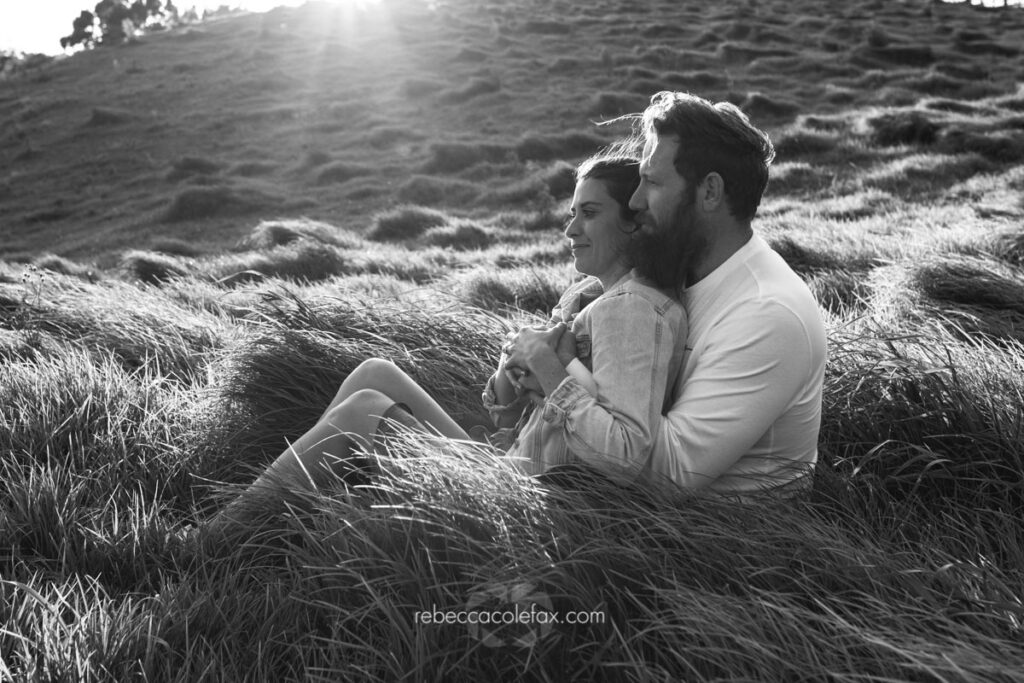 The images speak entirely for themselves. Two people settled into the long grass as the light poured over them, completely relaxed and completely themselves. The ring shot. The kiss on the cheek. The black and white of the two of them wrapped together as the sun burned through behind them. These are not images that could have been made on a beach. They belong entirely to this place and this light.