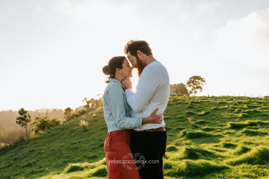 The Sunshine Coast hinterland is one of the most beautiful and underutilised settings for engagement photography in Queensland. While most couples look to the beach, the hinterland delivers something quietly extraordinary. Wide open skies, lush green hills, long grass catching the last of the golden light and a scale to the landscape that makes two people feel both intimate and completely at one with their surroundings.
