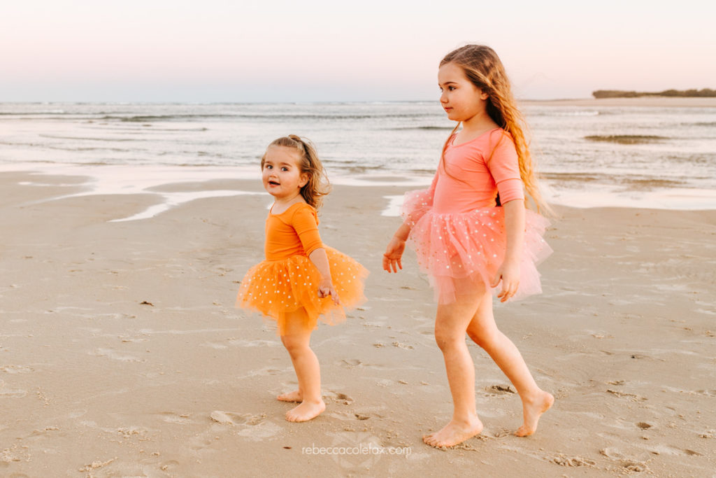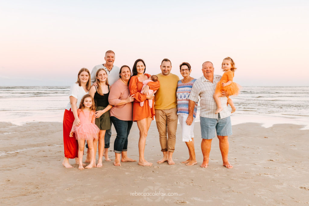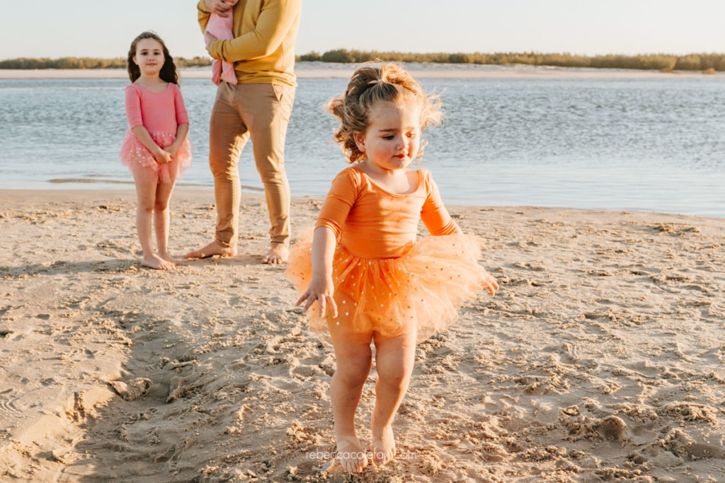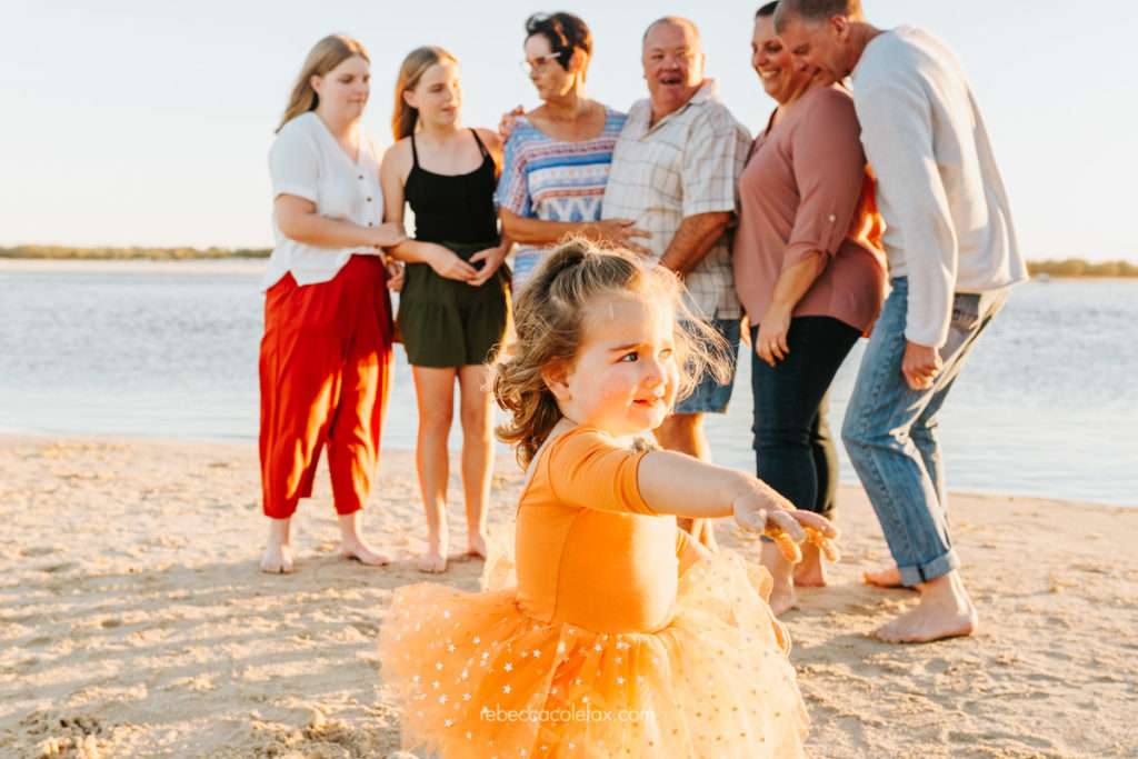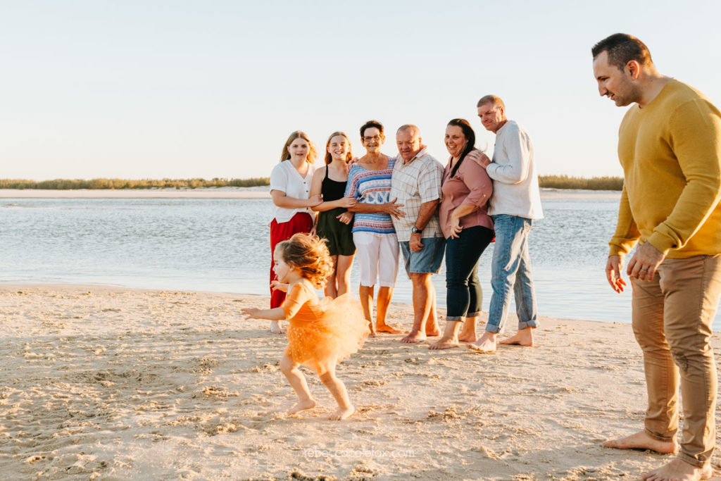 Sunshine Coast holiday photography at its best looks exactly like this. A large extended family, three generations, warm autumn colours and a stretch of Caloundra beach at golden hour that delivered everything it promised. The flat calm water, the soft pink sky and that little girl in the orange tutu who clearly had absolutely no intention of standing still.