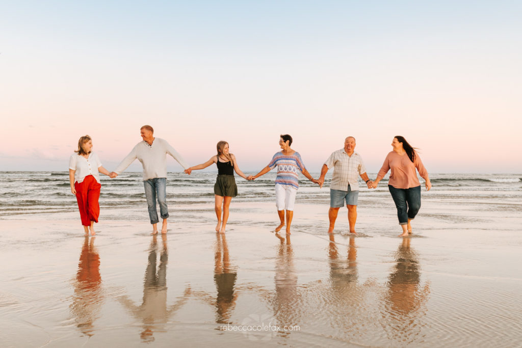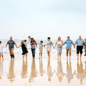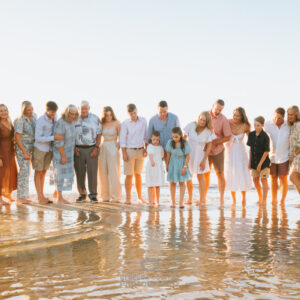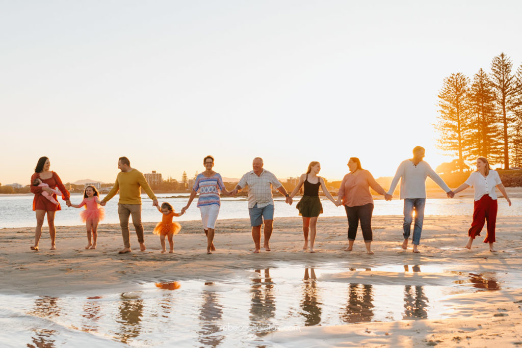 The Sunshine Coast stretches from Caloundra in the south all the way up through Noosa and beyond, and every part of it has something worth photographing. Caloundra in particular has that wide open tidal flat quality that makes large group sessions genuinely manageable. Everyone has room to move, the reflections in the shallow water add something extraordinary to the wider shots and the light at golden hour wraps around a group of this size in a way that simply doesn’t happen at midday.