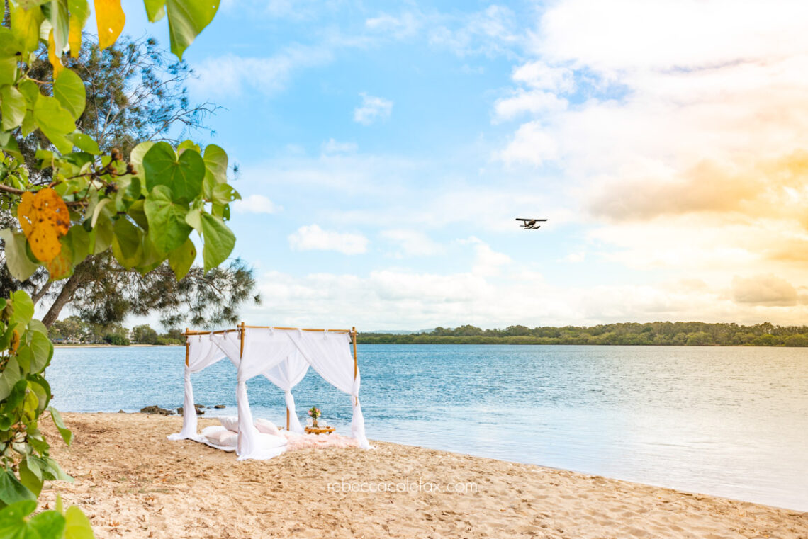 This proposal is a perfect example of what becomes possible when a couple dreams big and the photographer and vendors around them have the experience and the local knowledge to make it happen. A beautifully styled canopy setup on the water. Live guitar filling the air as the couple arrived. A seaplane landing on the Sunshine Coast waterway as part of the day. Every element considered, every moment coordinated and every second of it captured without missing a thing.