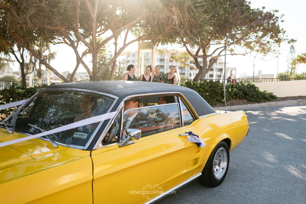 For a Sunshine Coast wedding photographer, Caloundra has its own distinct character and this day captured it perfectly. The rocky headland. The pandanus palms. The ocean sitting wide and blue behind a driftwood arch dressed with white florals and greenery. And a yellow Ford Mustang delivering the bride to it all.