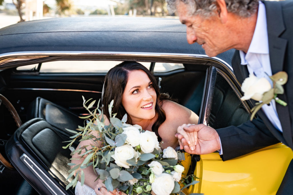 The bride arrived in a vintage yellow Mustang with her father, stepping out with a loose bouquet of white ranunculus, roses and eucalyptus while her bridesmaids in navy waited nearby. It is the kind of arrival that needs no embellishment. The car, the light, the dress. Done.