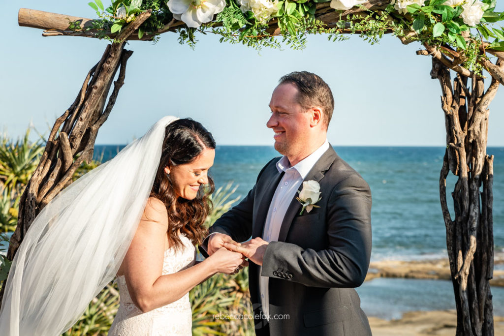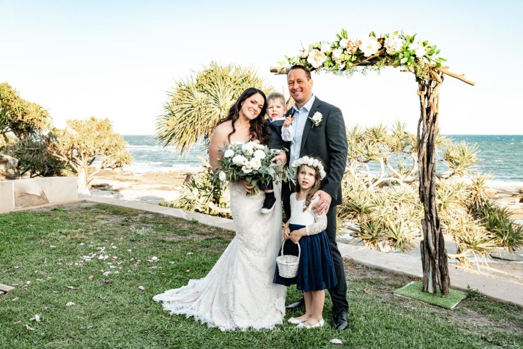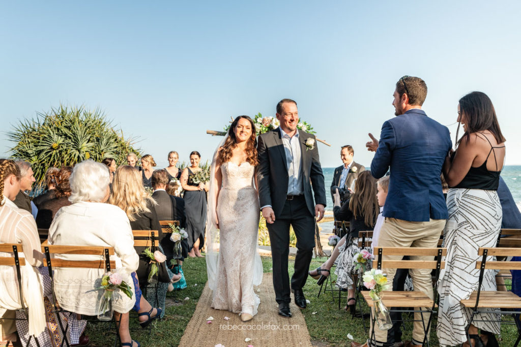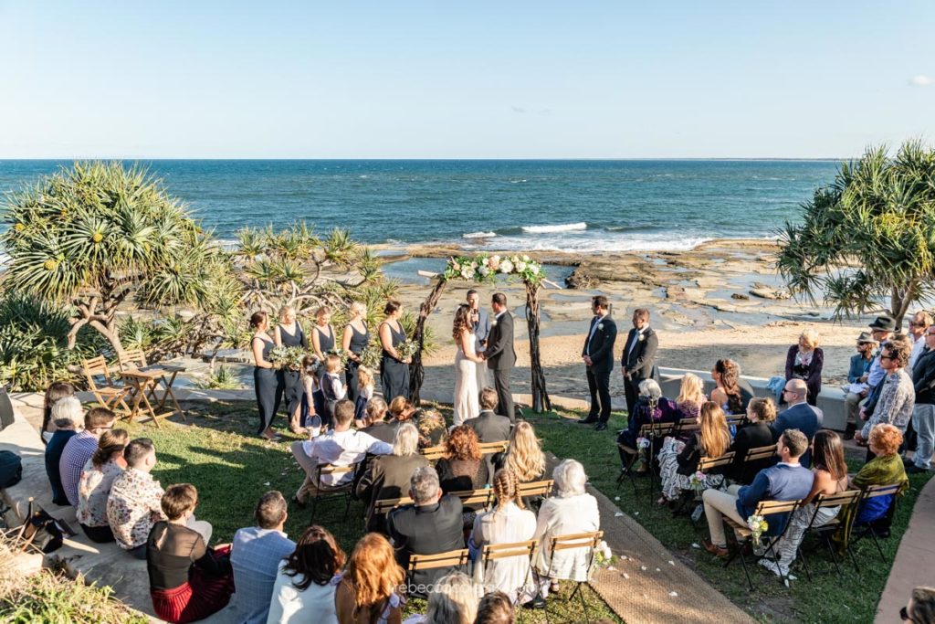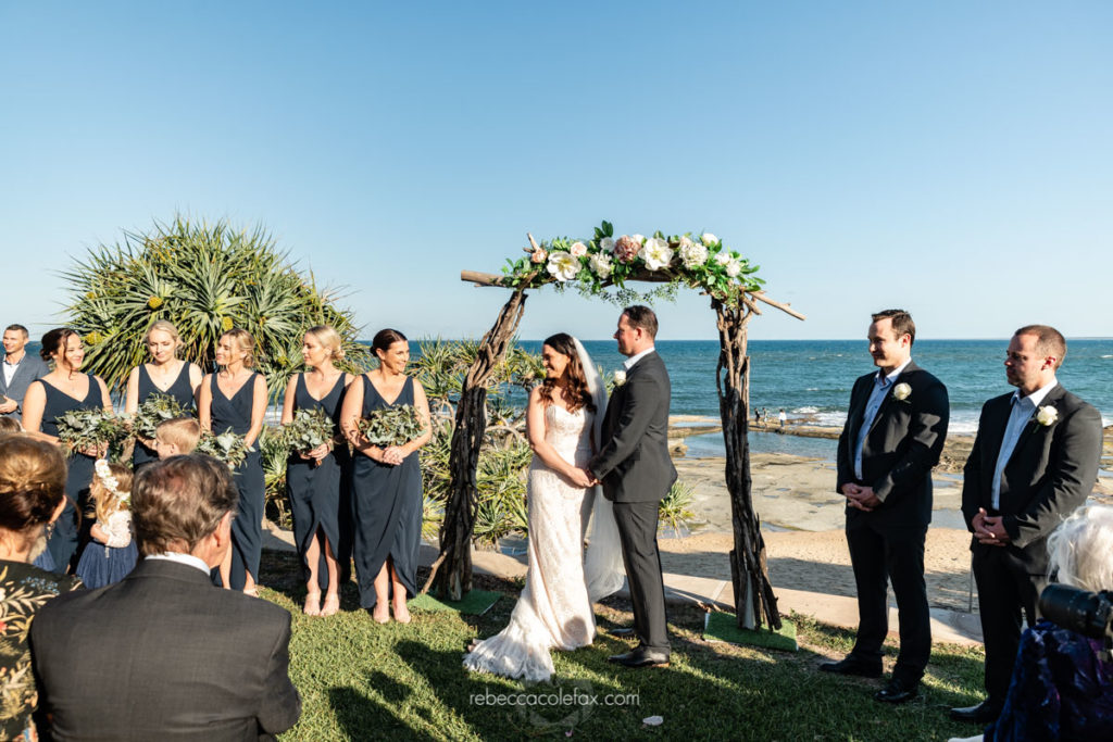 The ceremony was held on the lawn at the headland with the ocean directly behind the driftwood arch and the rocky Caloundra coastline stretching out on either side. Timber bench seating, pandanus palms framing the scene and that particular quality of late afternoon light that the Caloundra headland does so well.