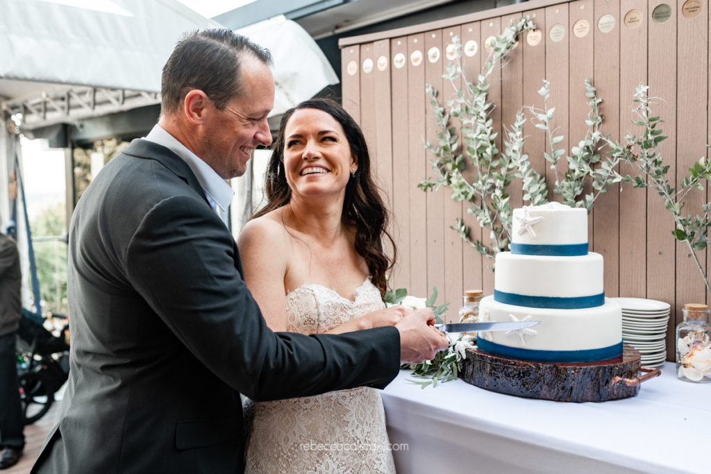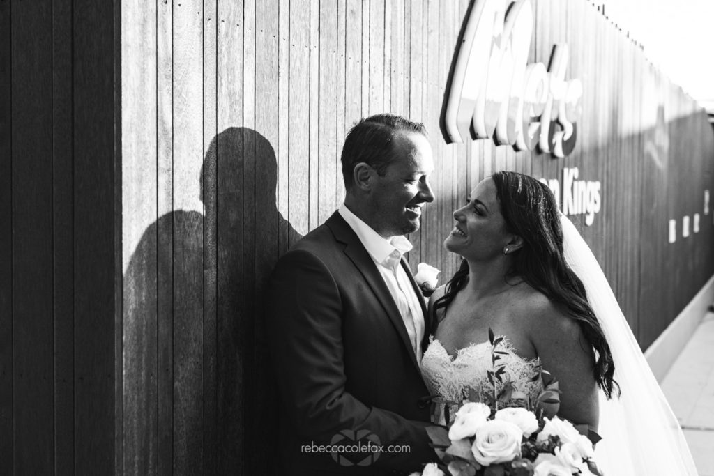 The reception was held at the venue on the headland with a white tiered cake with navy ribbon and eucalyptus. The cake cutting with both of them laughing. The shadow portrait against the timber wall. All of it relaxed, warm and completely genuine.