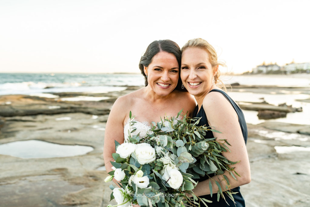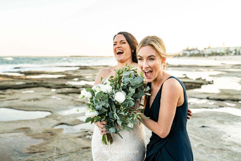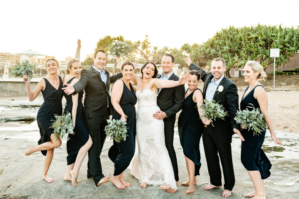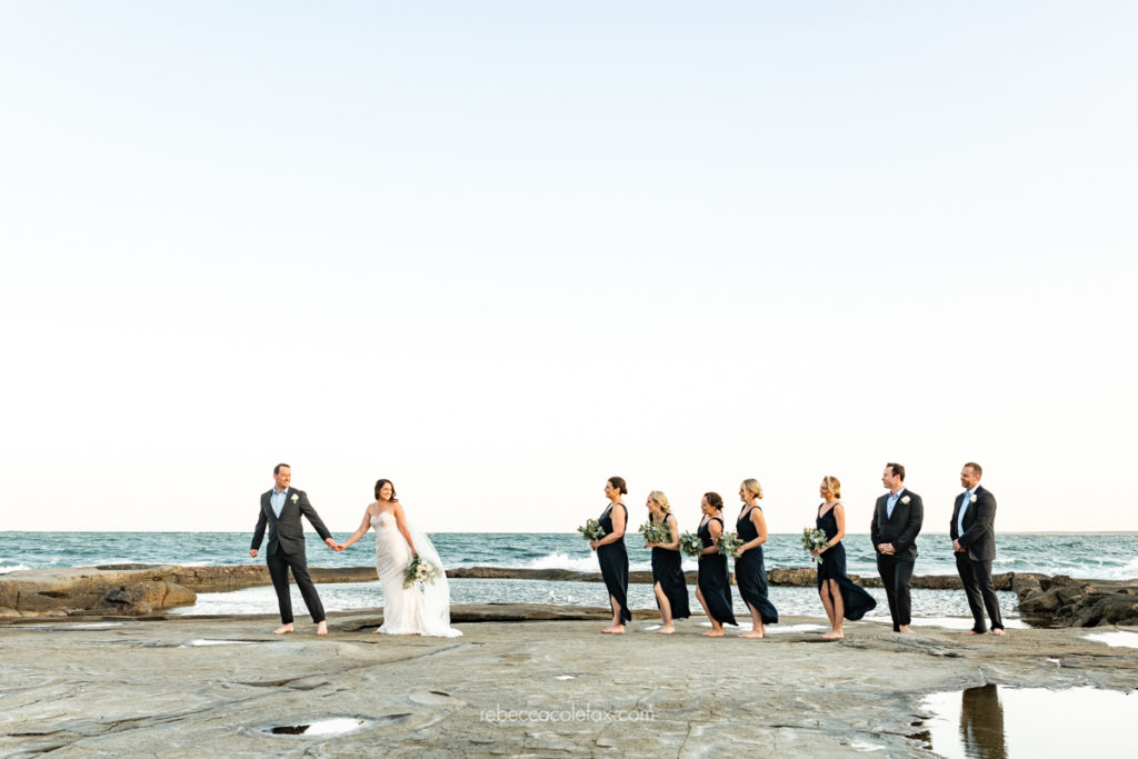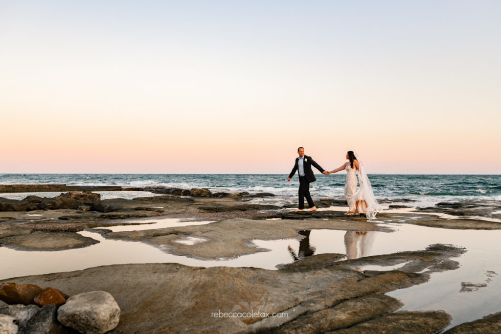 After the ceremony the bridal party made their way down to the rock platforms as the sun dropped toward the water. The whole group barefoot on the rocks, laughing. Then the couple alone on the flat rock shelves with the tidal pools reflecting everything around them. That wide shot of the two of them walking hand in hand across the rock shelf with the last of the pink sky behind them is one of the standout images in the Noosa Photography Co portfolio.