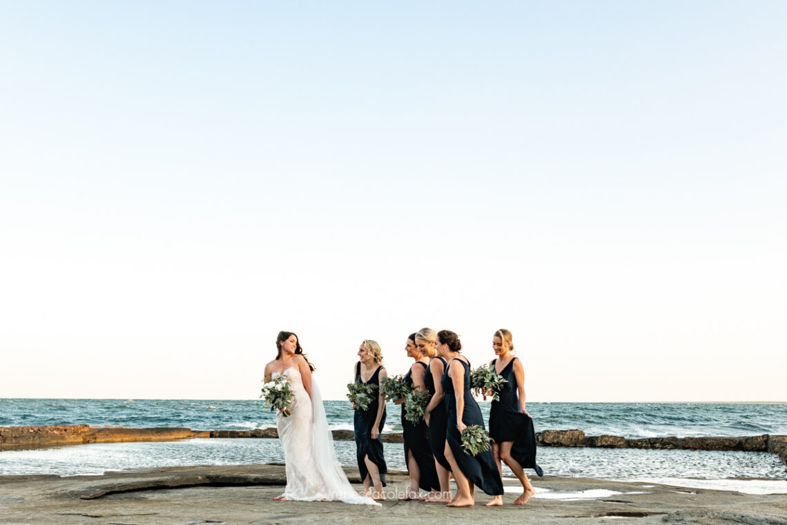 After the ceremony the bridal party made their way down to the rock platforms as the sun dropped toward the water. The whole group barefoot on the rocks, laughing. Then the couple alone on the flat rock shelves with the tidal pools reflecting everything around them. That wide shot of the two of them walking hand in hand across the rock shelf with the last of the pink sky behind them is one of the standout images in the Noosa Photography Co portfolio.