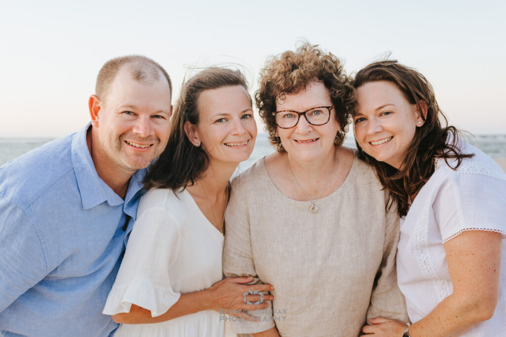 The session moved through the late afternoon as the light changed. The rocky headland at sunset for the wide group shots, the water’s edge for the candid walking frames, quieter moments between generations and individual portraits that capture each person exactly as they are right now. A newborn asleep on a shoulder. A toddler mid-expression. Grandparents with grandchildren who will one day be taller than them.